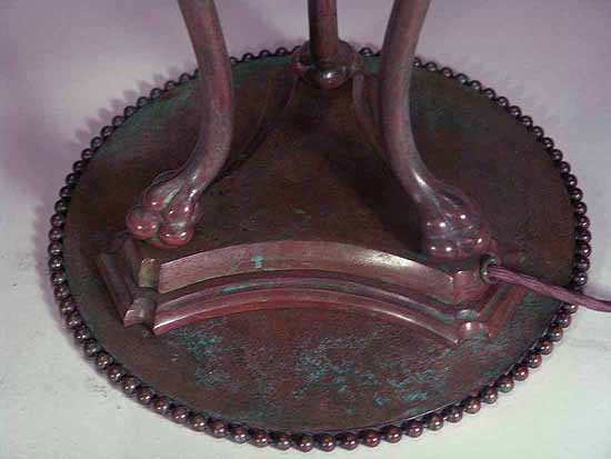 The suface of the lamp base and sockets are patinated with brown /dark green- brown Tiffany patina made in our Studio using the original recipe handed down by Tiffany Studios New York. No lacquer is used in the patination process.