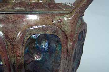 The suface of the lamp base and sockets are patinated with brown /dark green- brown Tiffany patina made in our Studio using the original recipe handed down by Tiffany Studios New York. No lacquer is used in the patination process.